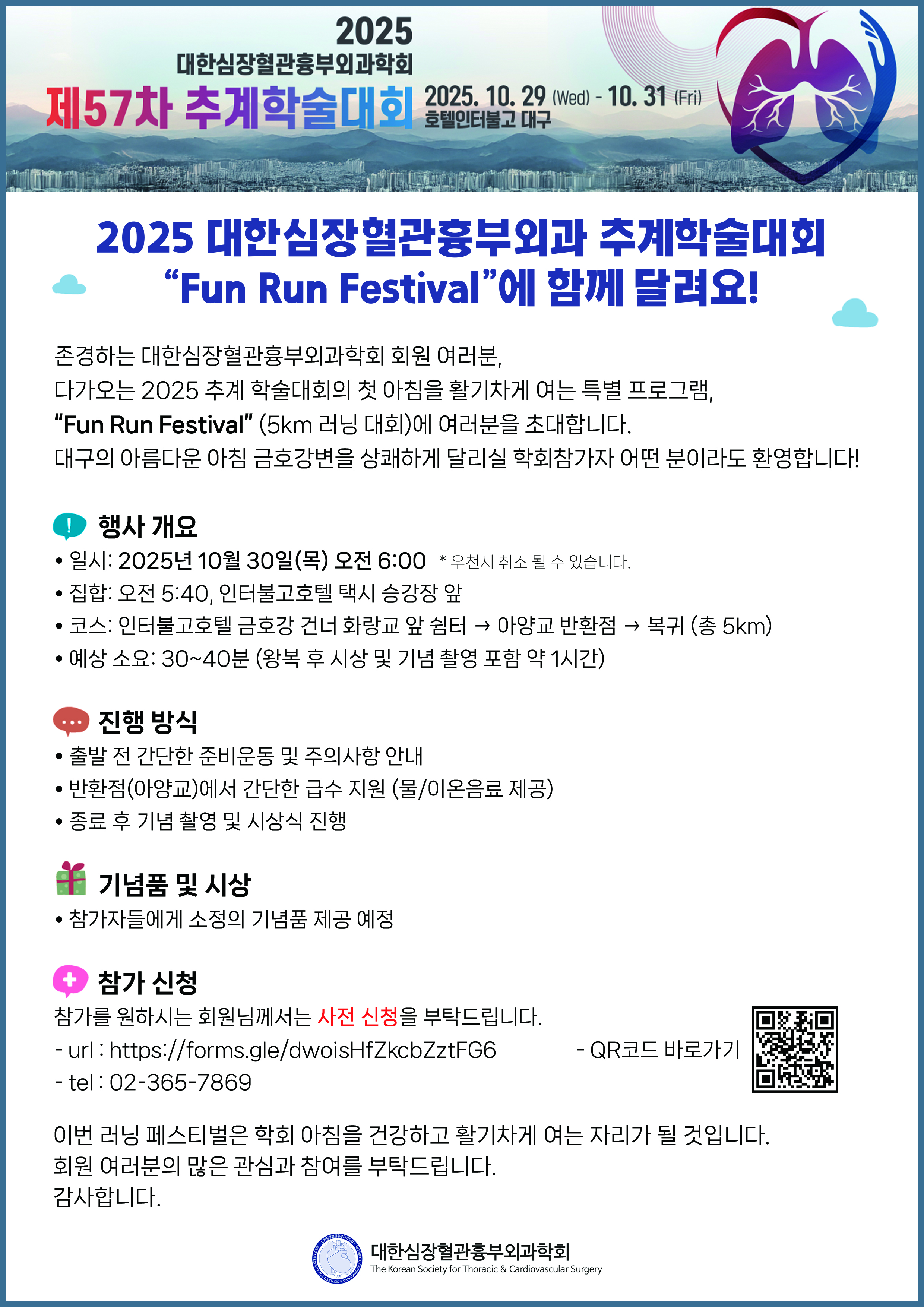 2025 대한심장혈관흉부외과학회 제57차 추계학술대회 "Fun Run Festival"에 함께 달려요!