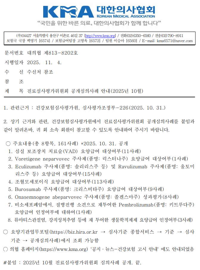 관련근거 : 건강보험심사평가원, 심사평가조정부-226(2025. 10. 31.)