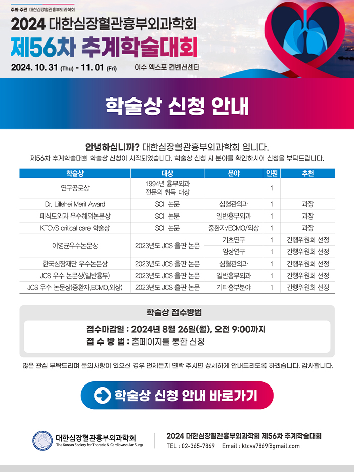 2024 대한심장혈관흉부외과학회 제56차 추계학술대회 학술상 신청 안내