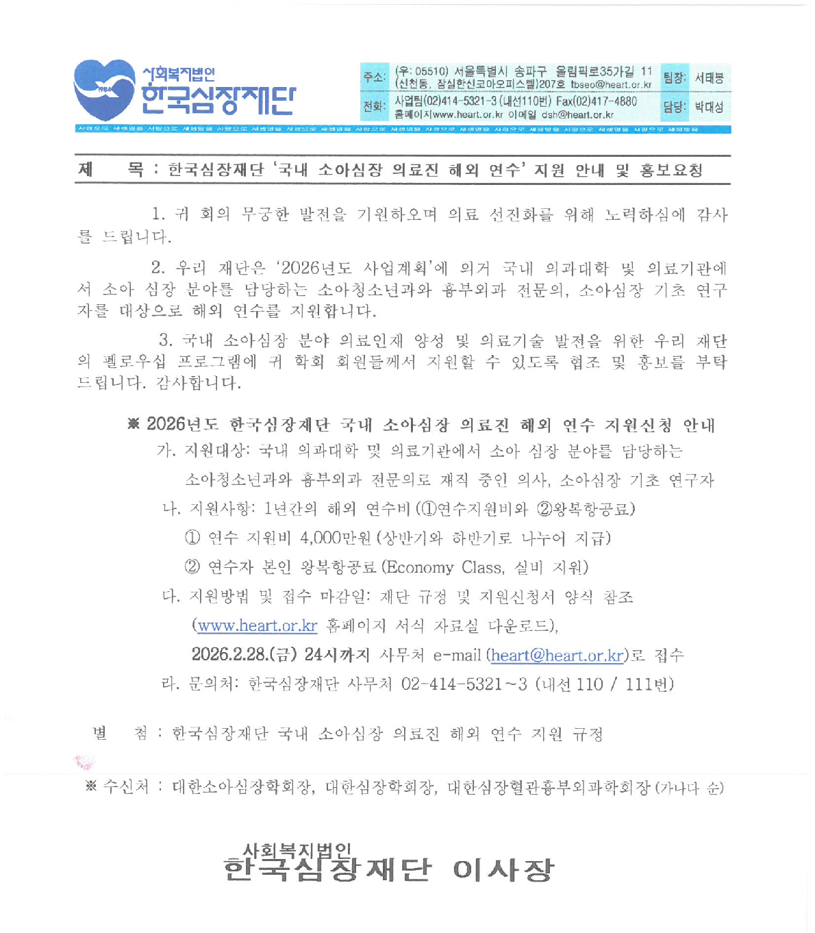 한국심장재단에서 '2026년도 사업계획'에 의거 국내 의과대학 및 의료기관에서 소아 심장 분야를 담당하는 소아청소년과와 흉부외과 전문의, 소아심장 기초 연구자를 대상으로 해외 연수 지원 사업을 진행하고자 합니다.